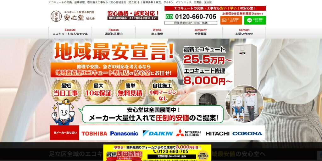 関東、東北、中部、近畿と全国19都道府県で展開しており、草加市内エコキュート交換業者の中でもトップクラスの低価格帯を実現しています。