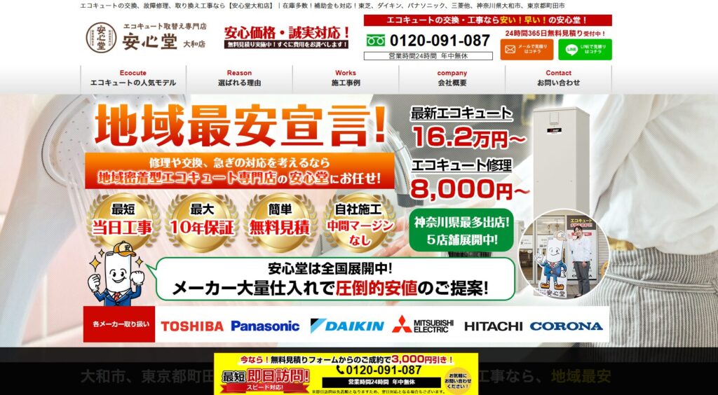 関東、東北、中部、近畿と全国19都道府県で展開しており、大和市内エコキュート交換業者の中でもトップクラスの低価格帯を実現しています。