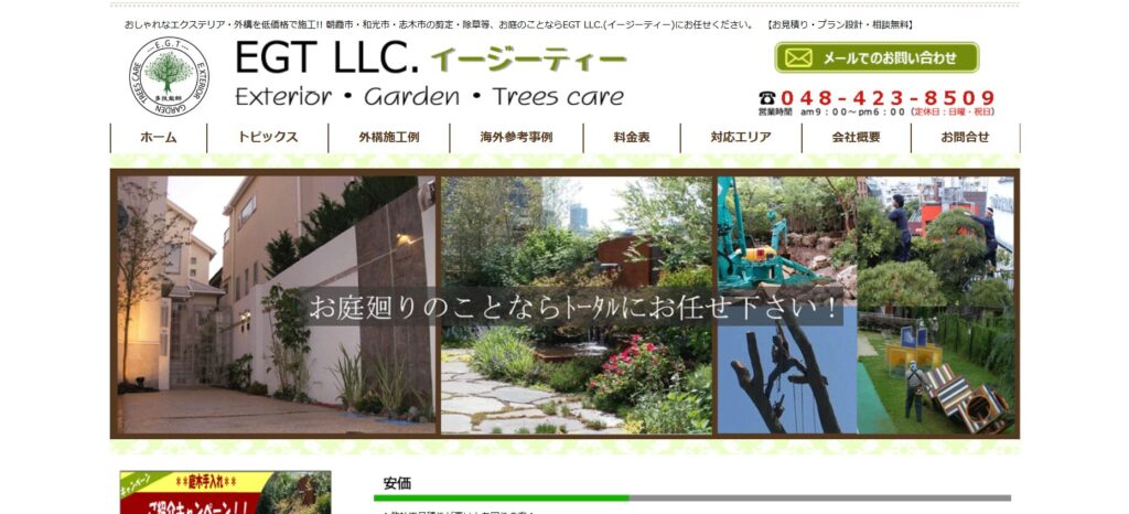 | サービス内容 | 外構工事設計・施工造園工事設計・施工植栽管理設計・施工各種門扉フェンス類工事各種ブロック・レンガ・石工事土木工事一般 |