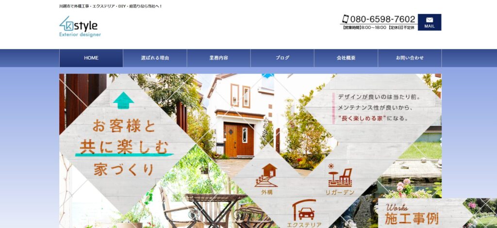 | サービス内容 | 外構、庭、エクステリア工事、コンクリート工事、ブロック、れんが工事、タイル工事、塗装工事、土木工事、シャッター工事、物置き、リフォーム、外壁工事、給排水設備工事 |
