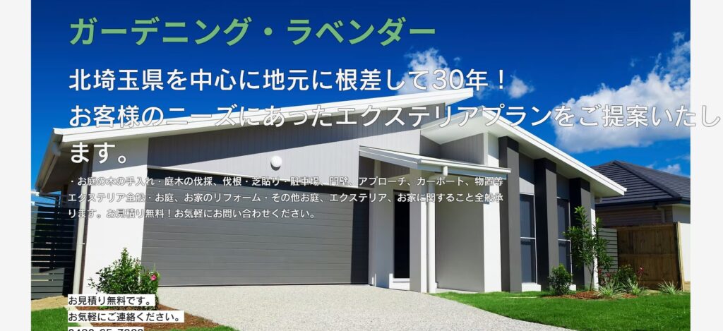 | サービス内容 | 外構・エクステリア工事、エクステリアプランニング、リフォーム・ガーデンルーム、テラス・ウッドデッキ、造園・舗装、外壁・屋根塗装、解体工事 |