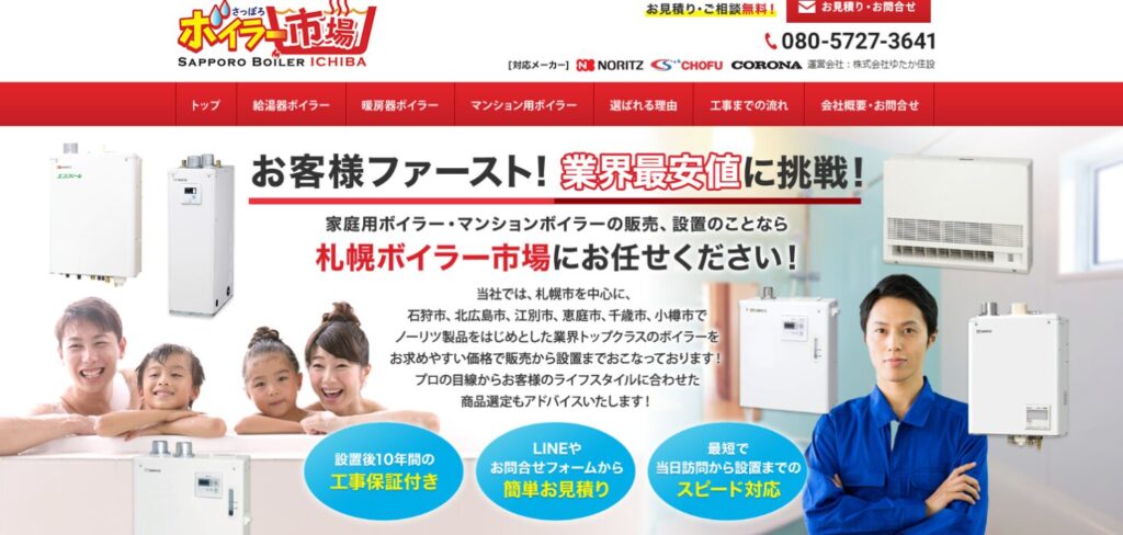 取り扱いメーカー | リンナイ、ノーリツ、パロマ、TOTO、ハーマン、パーパス、長府(給湯器)コロナ、東芝(エコキュート) |