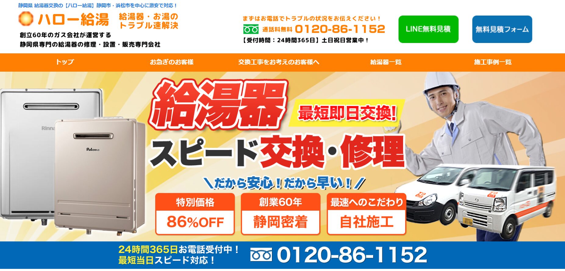 ガス救は、静岡市葵区全域に対応している給湯器交換業者です。24時間365日受け付けしており、最短で当日中(土日もOK)に出張してもらえます。ウェブサイトの見積もりフォームから利用すると、料金が3,000円オフになるため大変お得です。工事と商品のどちらにも10年保証があるため、施工後も安心して給湯器が使い続けられます。