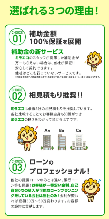 ミラエコのスタッフが提示した補助金が万一もらえない場合は、ミラエコが保証。